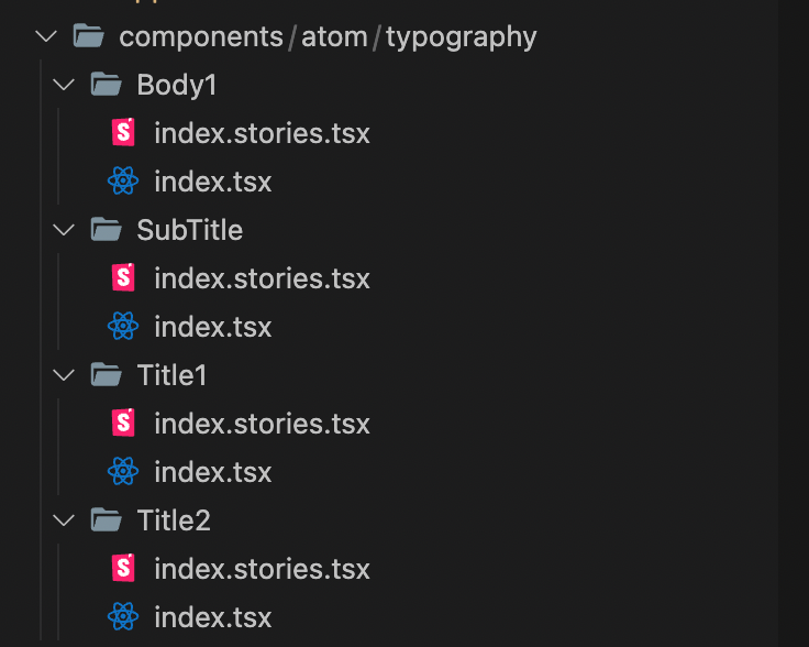 이제 아토믹 디자인 패턴을 적용하여서 일부 typography 컴포넌트를 만들어 보았다. 디렉토리 구조는 아래와 같이 만들었다.