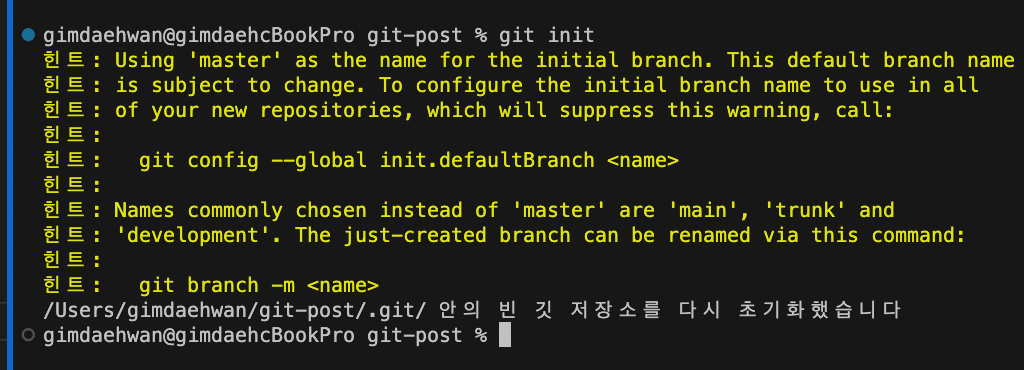 깃 을 세팅하는 명령어이다. 해당 명령어를 치면 .git 이라는 파일이 생긴다. 해당 파일에는 깃에 관한 모든 설정이 담겨있다.