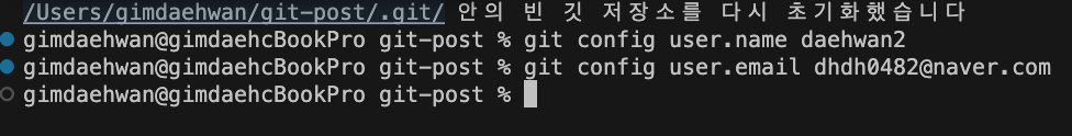깃 을 세팅하고 나면, 내가 어떤 사용자인지에 대해서 설정을 해줘야 한다. 설정하는 명령어이다. github에서 보이는 이름과, 이메일을 설정해주면 된다.