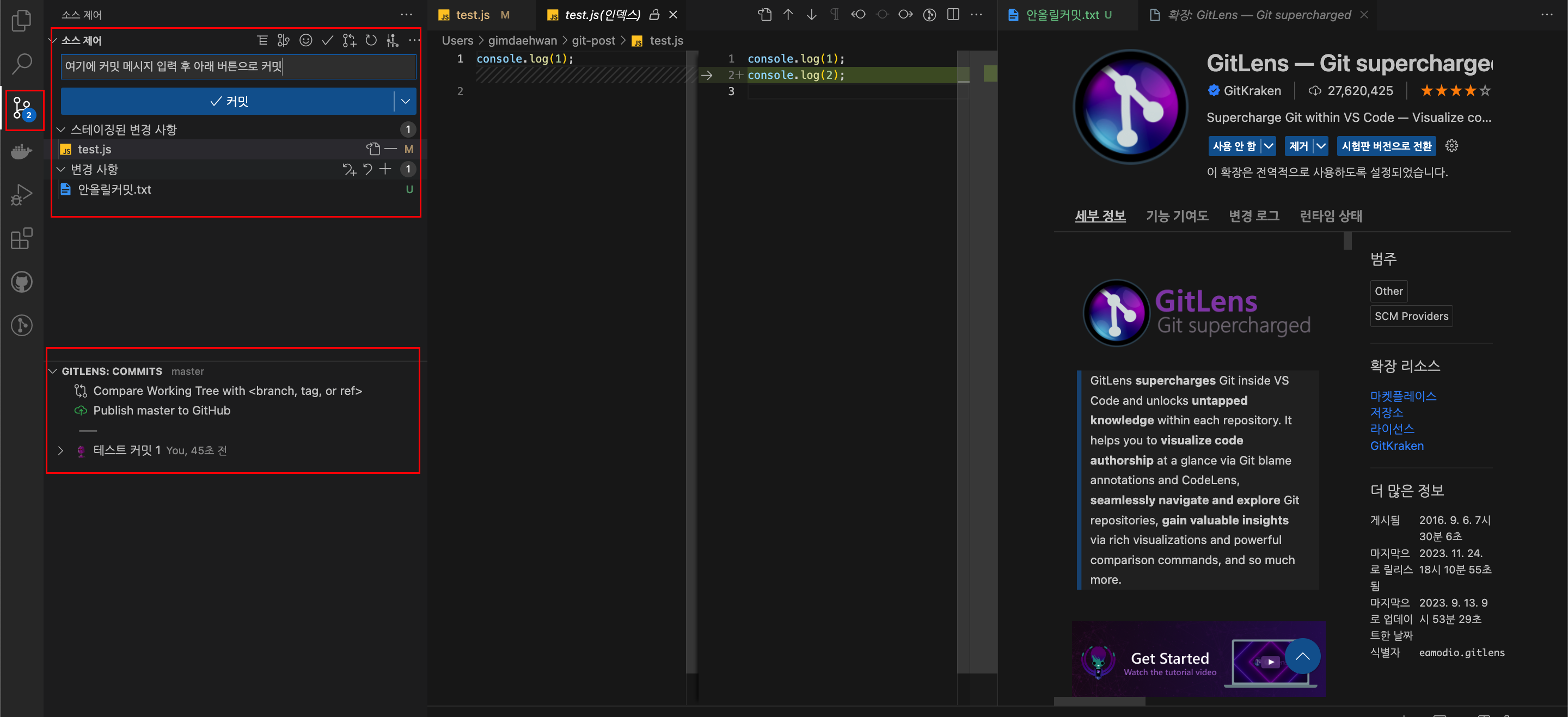 그 흔하디 흔한 git add 와 git commit 명령어를 뺀 이유는 vscode 의 gitlens 라는 확장프로그램을 통해서 해당 작업을 진행하고 있기 때문이다. git lens 를 이용하면 시각적으로 변경사항을 확인 후 커밋을 할 수 있으며, 보다 안전하고 실수가 적게 커밋을 할 수 있다.
