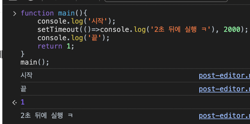 setTimeout() 이 실행이 되고 나서 작업이 완료되지 않은 상태, 즉 "2초 뒤에 실행 ㅋ" 이라는 string 이 콘솔에 찍히는 작업이 완료되지 않은 상태로 작업이 진행되게 된다. 그래서 setTimeout 은 비동기 함수이다.