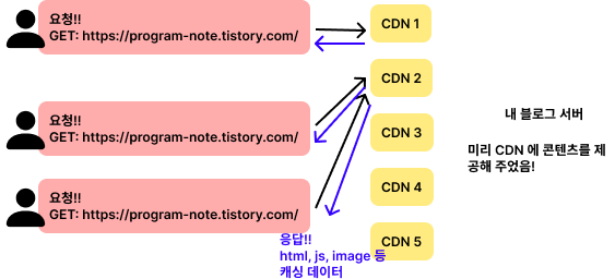 CDN 은 미리 내 블로그 서버로 부터 html, js, image 등의 캐싱 데이터를 받아놓는다. (캐싱)