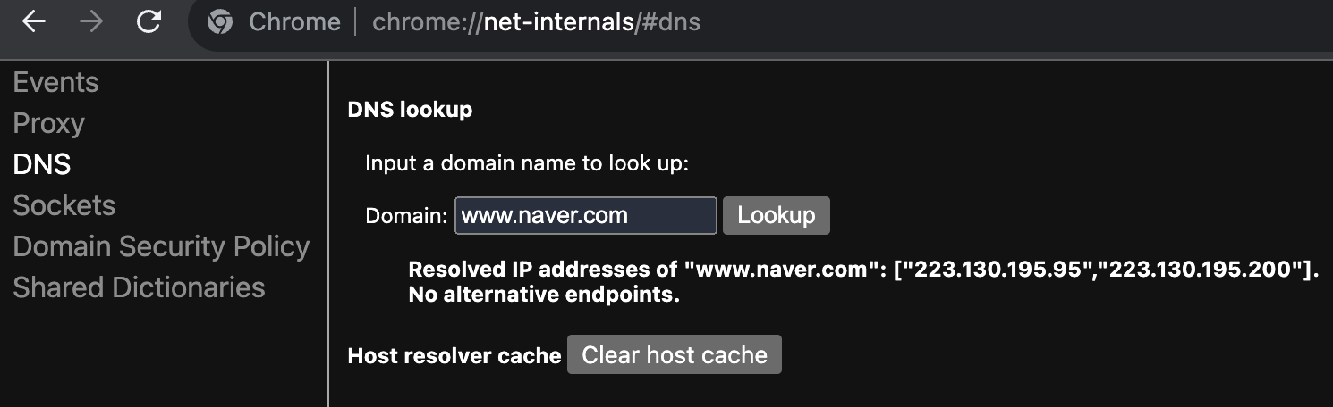 크롬 브라우저의 경우 chrome://net-internals/#dns 해당 경로로 접근을 하게 되면