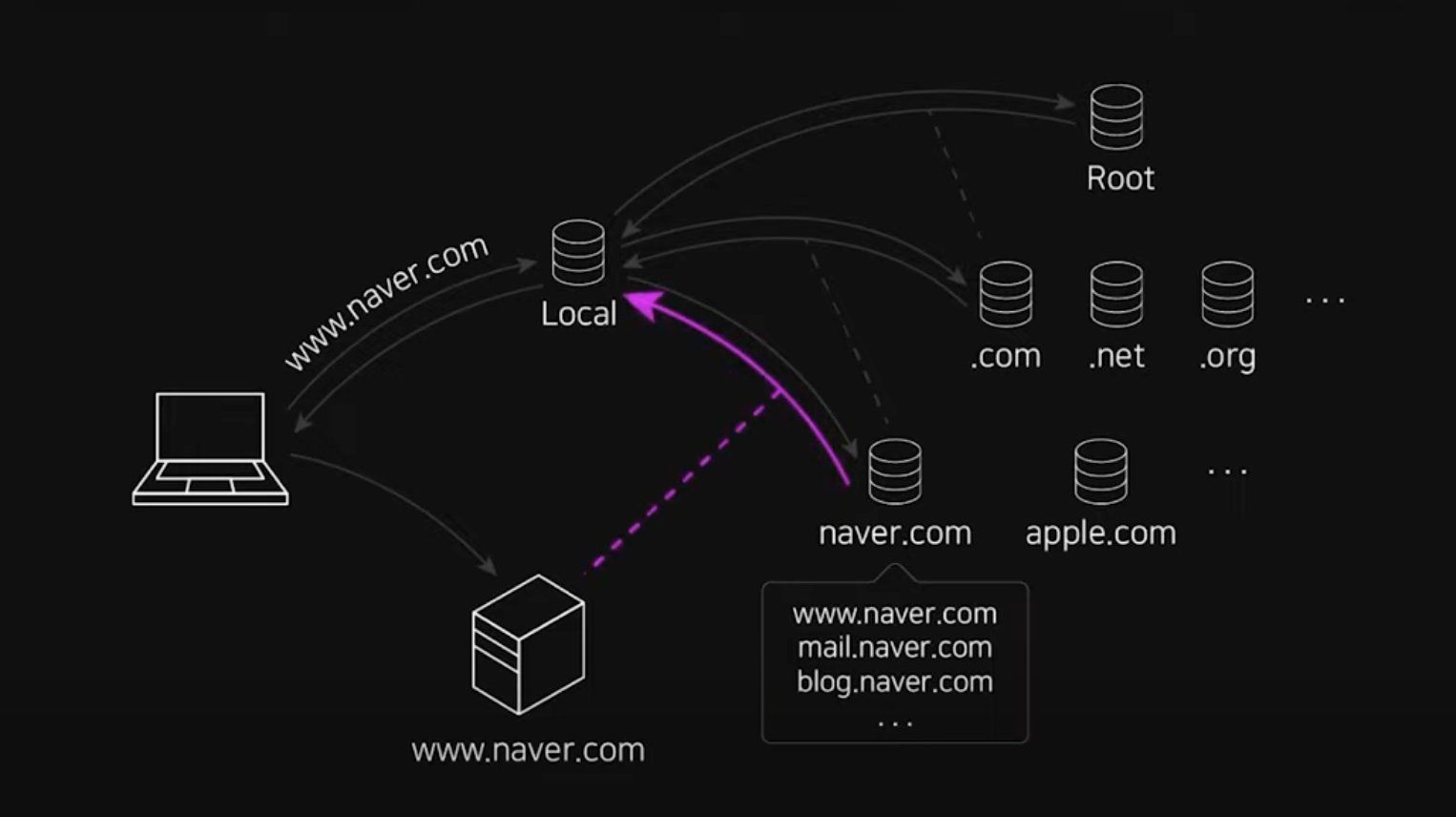 먼저 본인의 피씨 hosts 파일과 브라우저의 캐싱되어 있는 것에서 www.naver.com 의 ip 주소가 저장이 되어있는지 확인한다. 로컬에 캐싱이 되어 있다면 바로 ip 주소를 얻을 수 있다. 위 그림에서 Local 에 해당하는 과정이다.