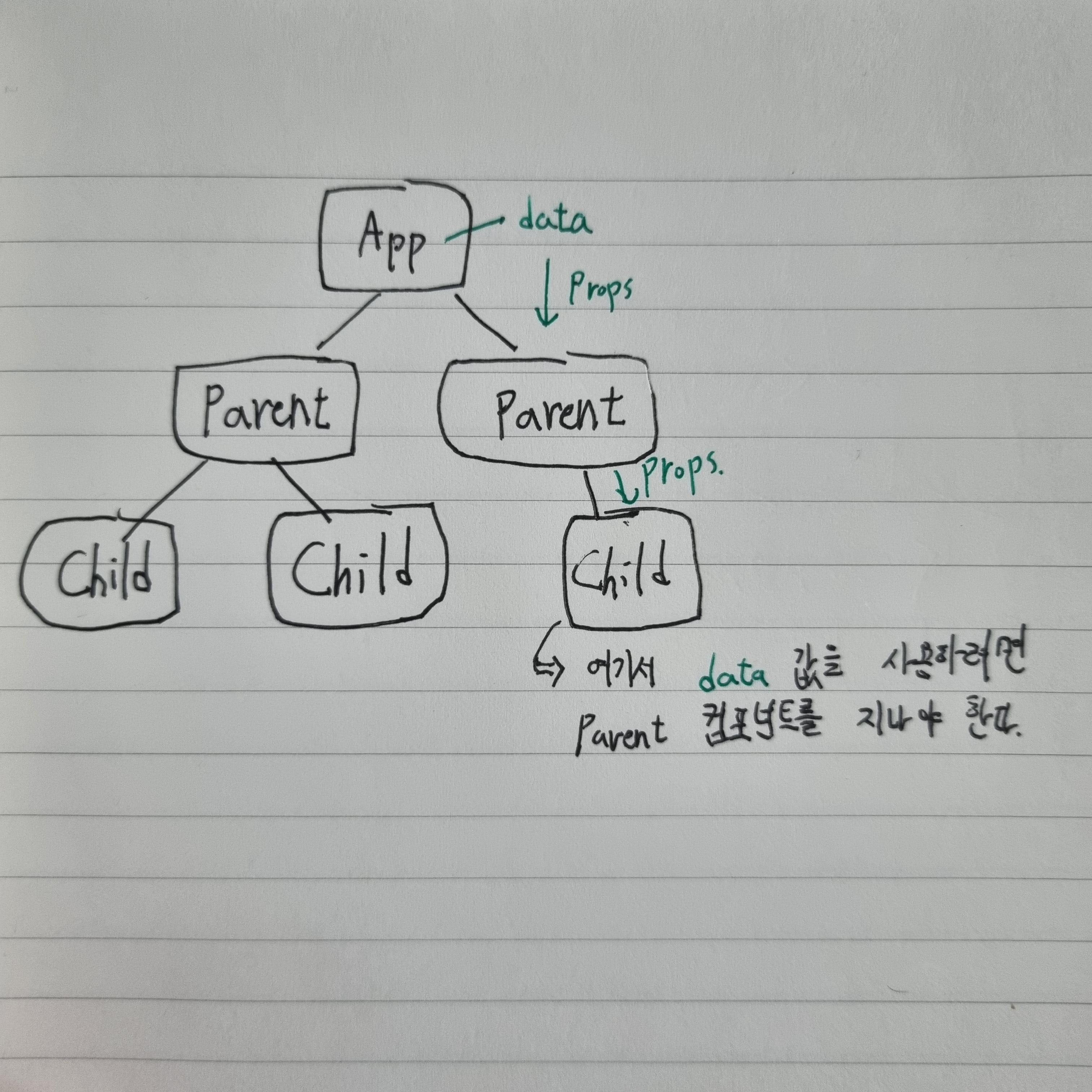 위 그림에서 App 컴포넌트에서 맨 아래 Child 컴포넌트로 데이터를 주기 위해서는 필수적으로 Parent 컴포넌트를 한번 통해야만 한다.