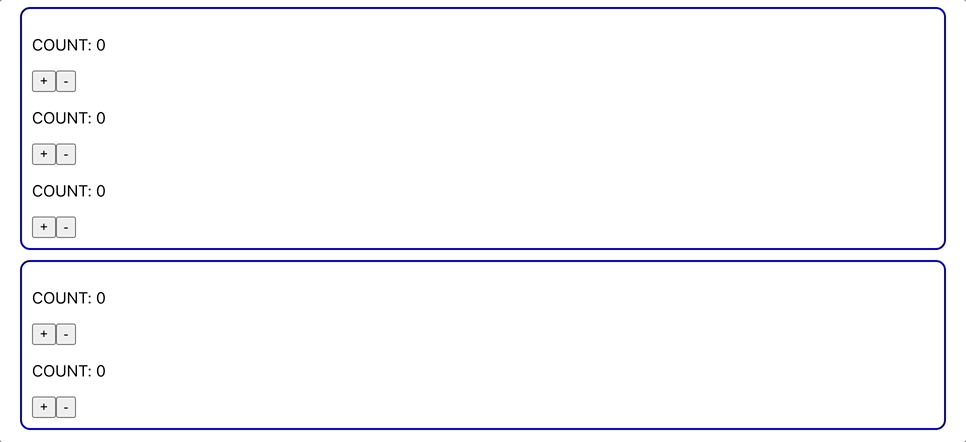 첫번째 섹션과 두번째 섹션의 Context.Provider가 따로 생성이 되어서 데이터가 서로 다르게 동작하는 것을 볼 수 있다..!