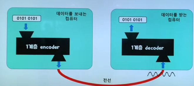 - 0과 1의 나열을 아날로그 신호로 바꾸어 전선으로 흘려 보내고(encoding)