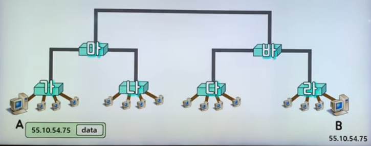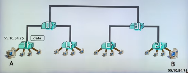 -A는 데이터앞에 목적지 주소, 즉 B의 주소를 붙입니다