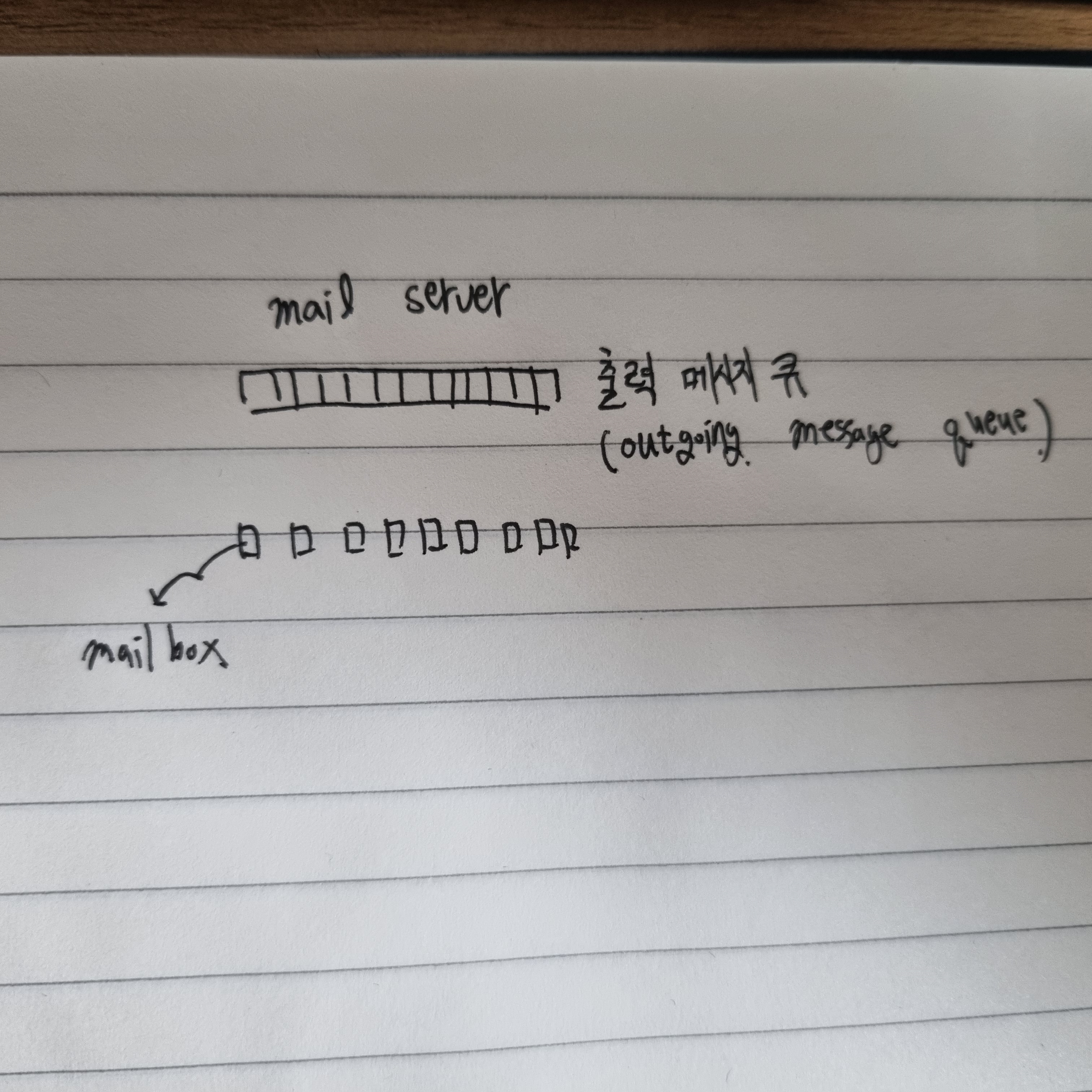 mail server 는 출력 메시지 큐 ( outgoing message queue ) 와 mailbox 로 구성되어 있다.