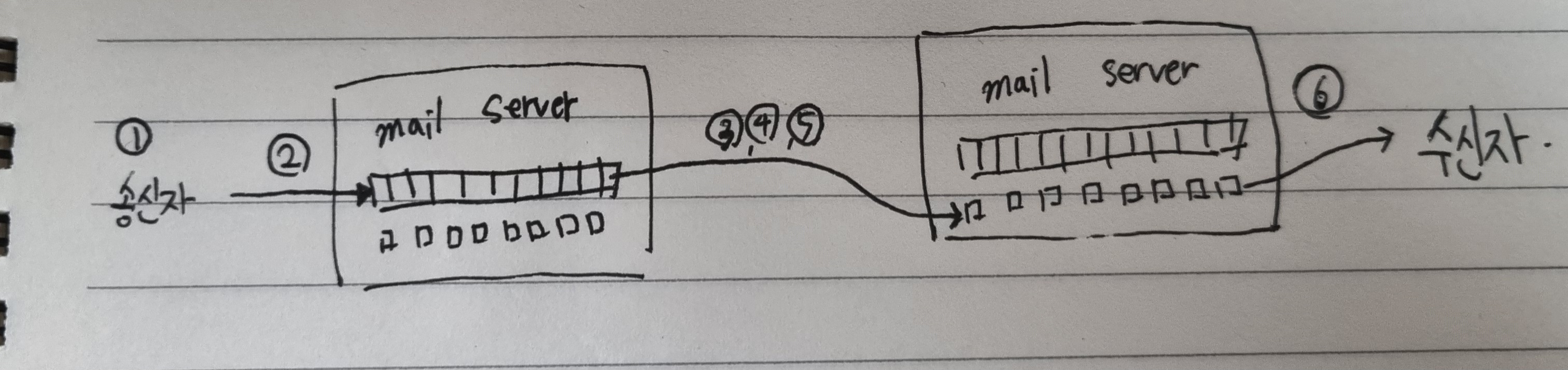 - 송신자 메일 서버의 출력 메시지 큐 ( outgoing message queue ) 에 저장