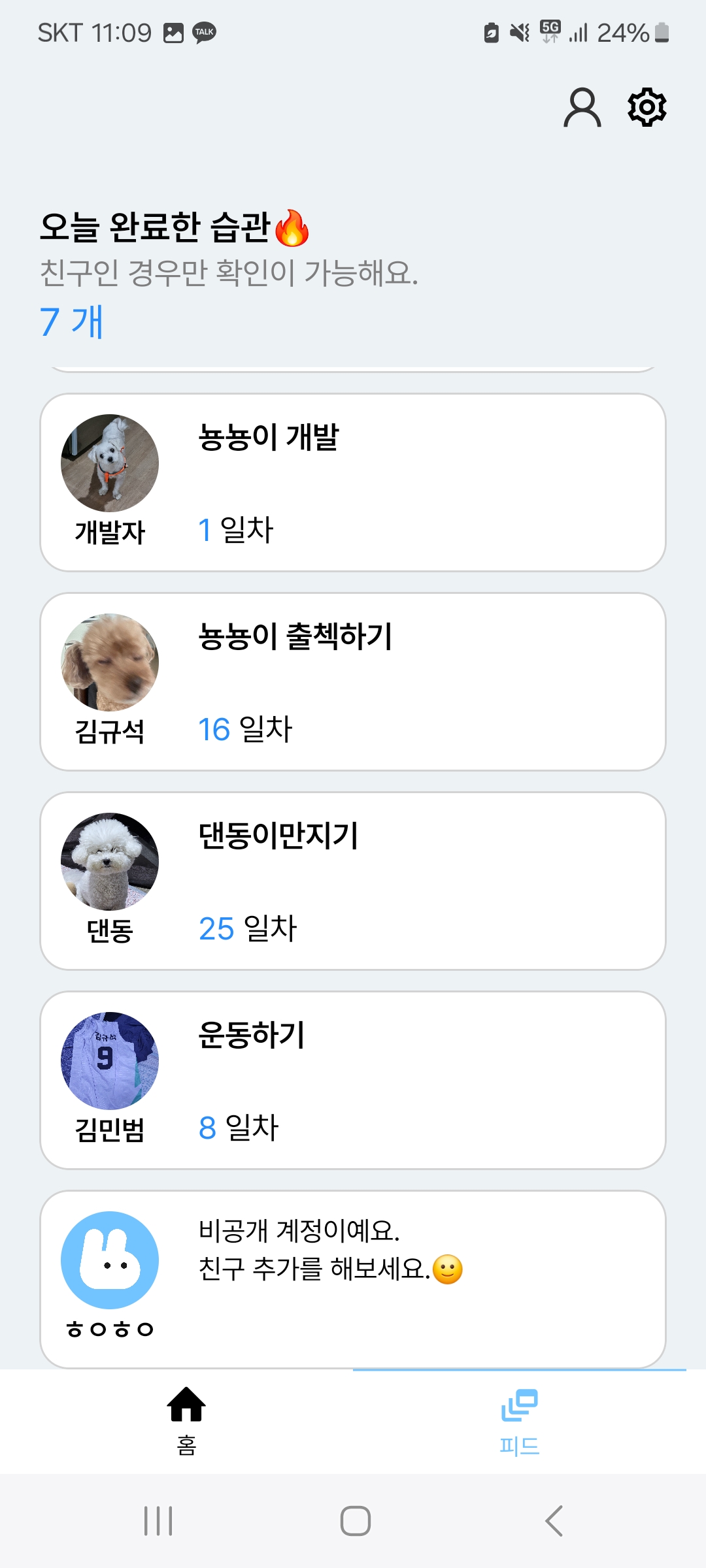 친구를 맺어, 피드에서 친구가 오늘 완료한 습관을 볼 수 있다.
