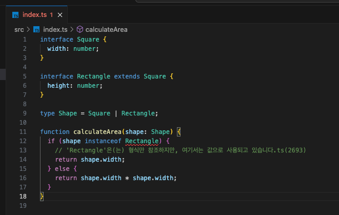 - instance of 는 런타임에 일어나지만, interface 는 타입이기 때문에 아래와 같은 오류가 난다.