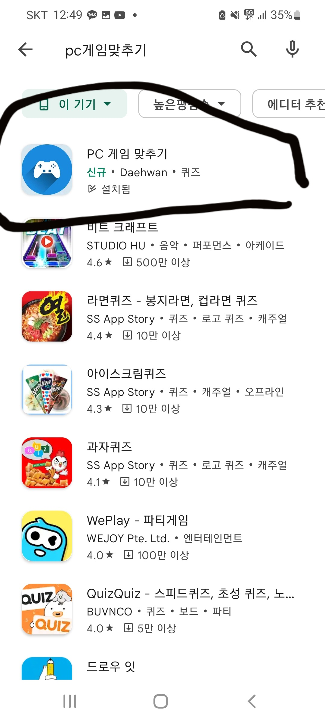 이렇게 나오는데 기능, 디자인도 엄청나게 간단한데 10만 다운로드 이상인 어플이 굉장히 많았다. 친구가 이걸 보고 PC게임 맞추기 없는데 만들어 봐라해서 만들게 되었다. 게임 형식은 이미지를 주고 글자를 맞추는 형식이다. PC게임 맞추기라고 치면 제일 상단에 뜬다. 상위노출이 이렇게 잘되는지는 몰랐다.